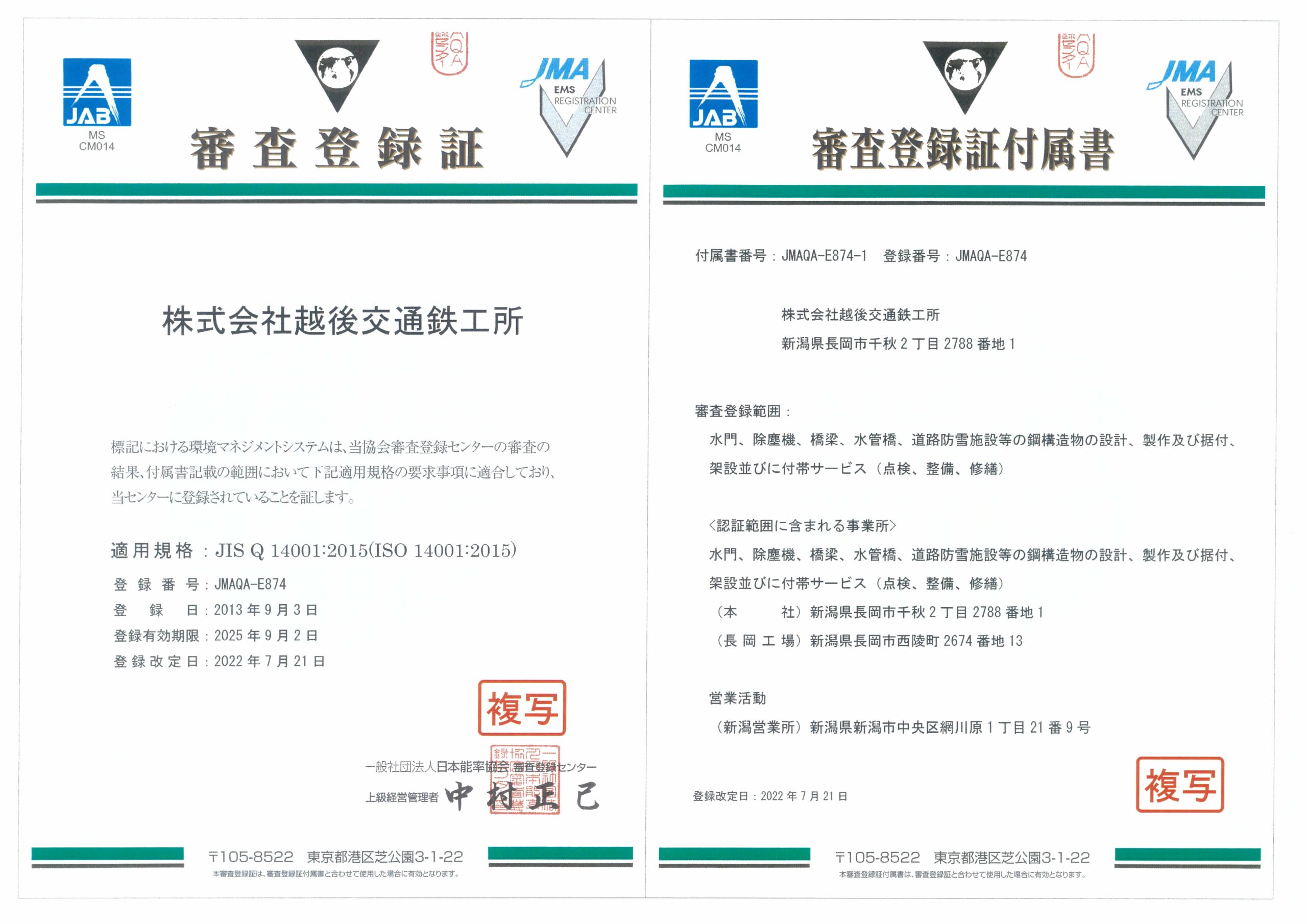 株式会社越後交通鉄工所は、全部門で「ISO9001:2015」、「ISO14001:2015」の認証を取得しています。